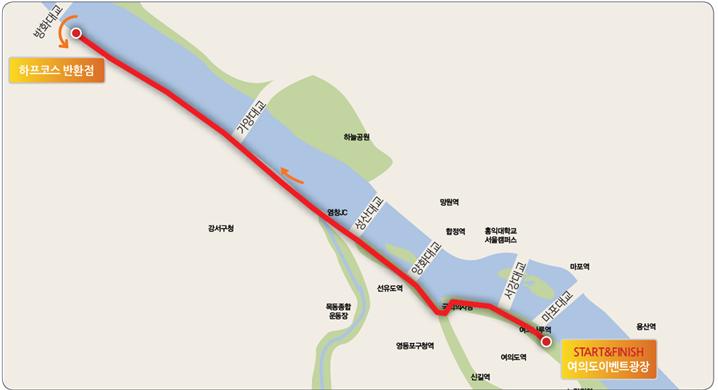 하프, 10km, 5km, 10km커플 4종목이 실시되며, 여의도 한강공원 이벤트광장(여의나루역)에서 출발, 마포대교를 지나 방화대교를 돌아오는 코스입니다.