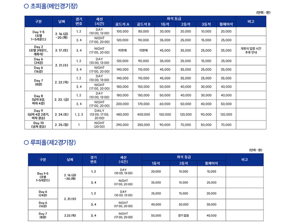 - 메인 경기장의 가장 등급이 낮은 3등석 기준으로 대회 첫날 데이 세션 티켓은 1만원이며 9일 차 티켓은 9만 원, 10일 차 티켓은 5만 원입니다.