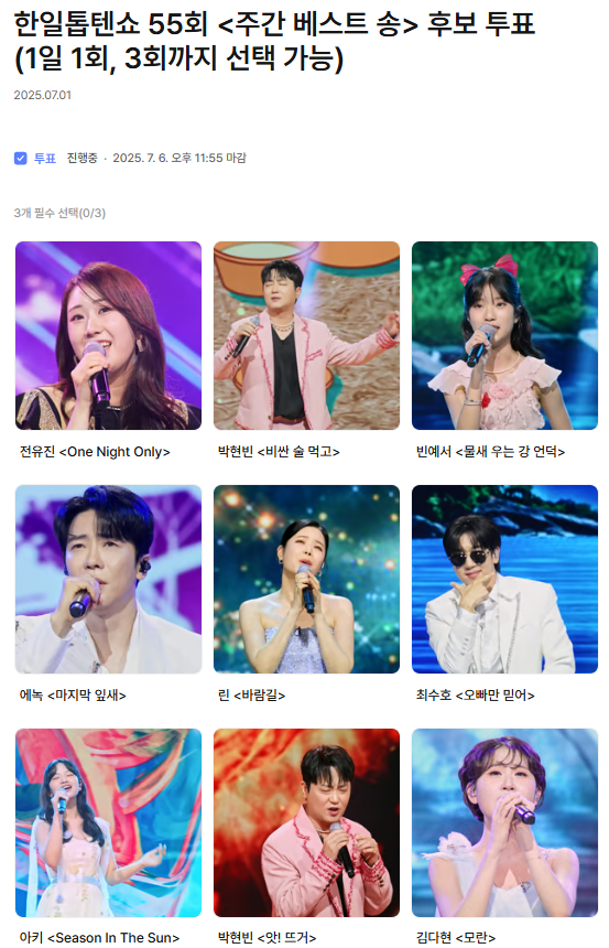 매일 3명에게 투표가 가능하니 꼭 참여해주세요. 매주 일요일 자정까지 매일 3팀에게 투표하세요!